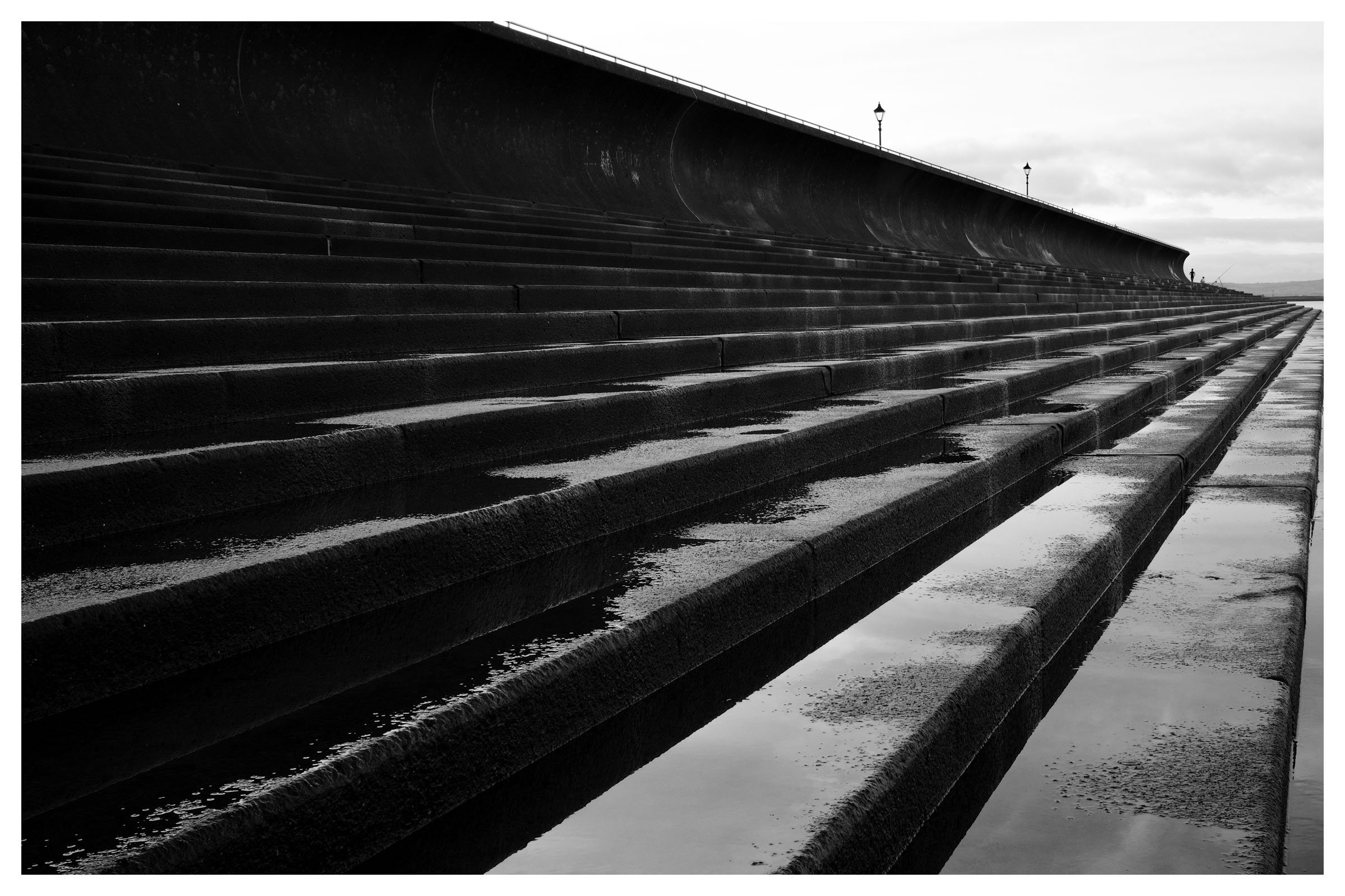 A jogger in the far distance gives scale to the height of the sea wall and a fisherman trying his luck.