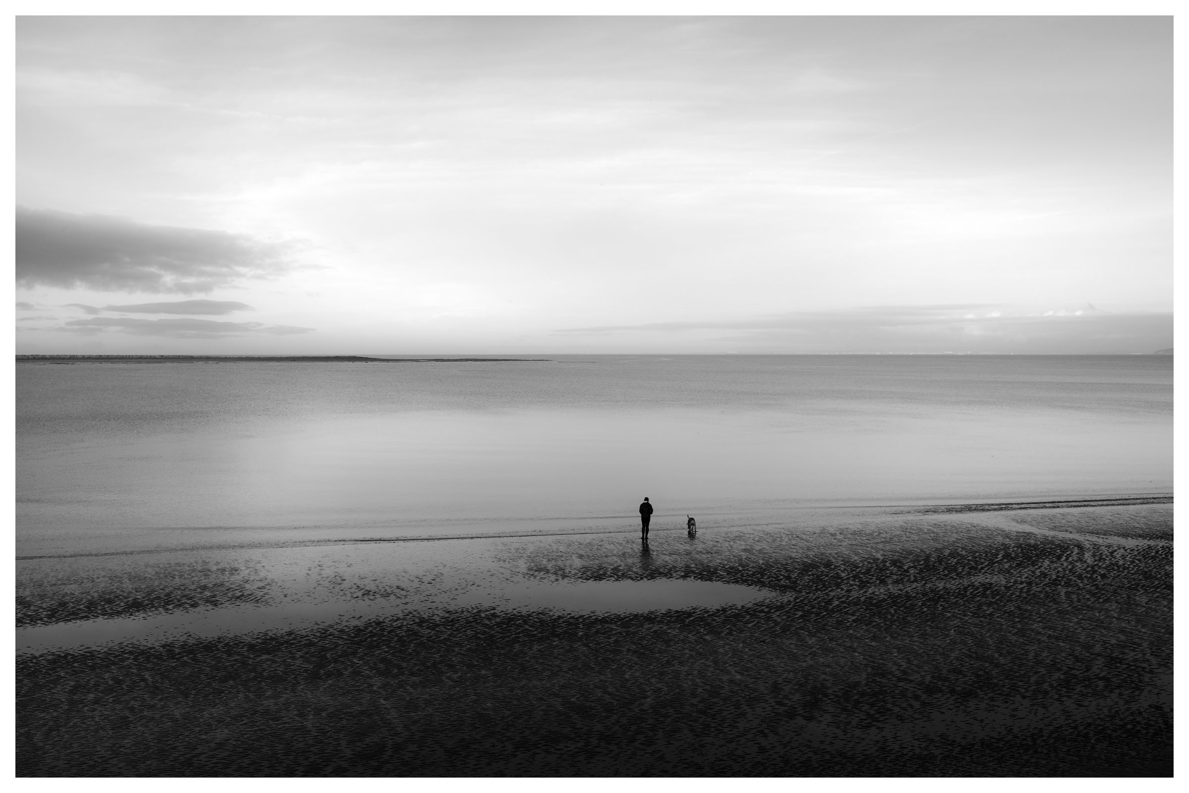 Woman and her dog on the beach at the edge of the receding tide.