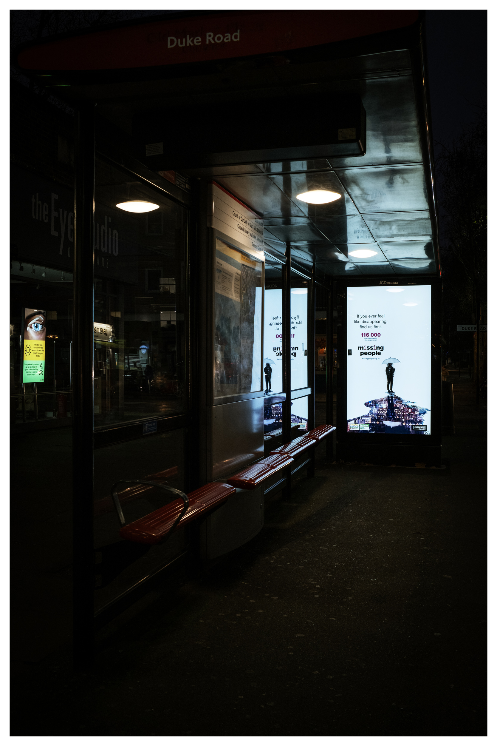 What initially caught my attention was how the sign illuminated the seats…Then I noticed the serious intention of the advertisement…But if you look on the left you will see a blue eye….Looking for someone ?