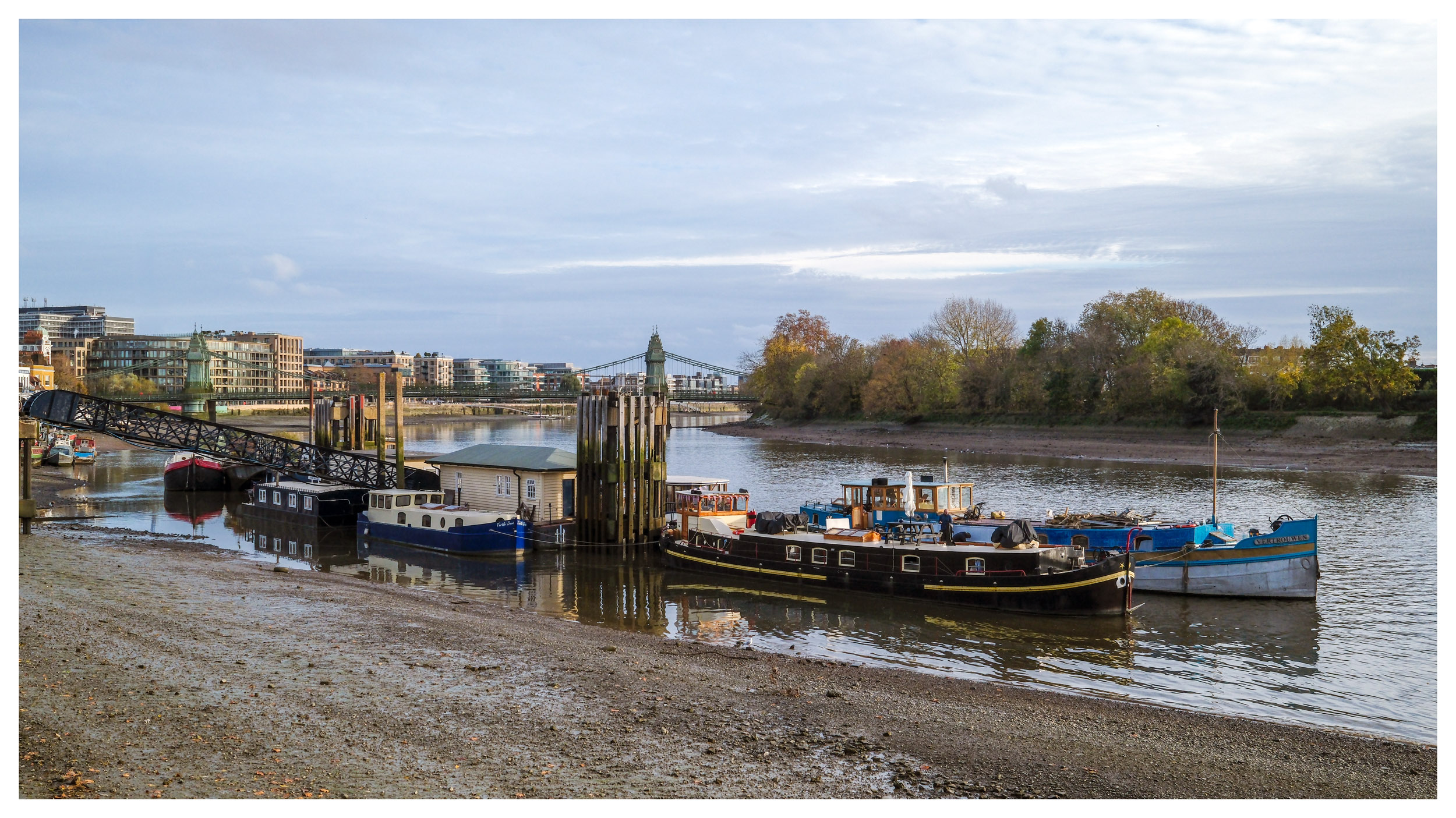House Boats at low tide on the River Thames by Hammersmith Bridge. The warm glow provided by the setting sun.